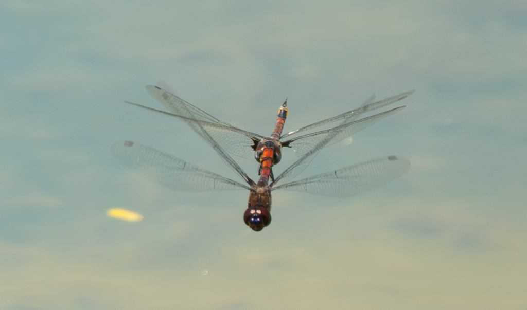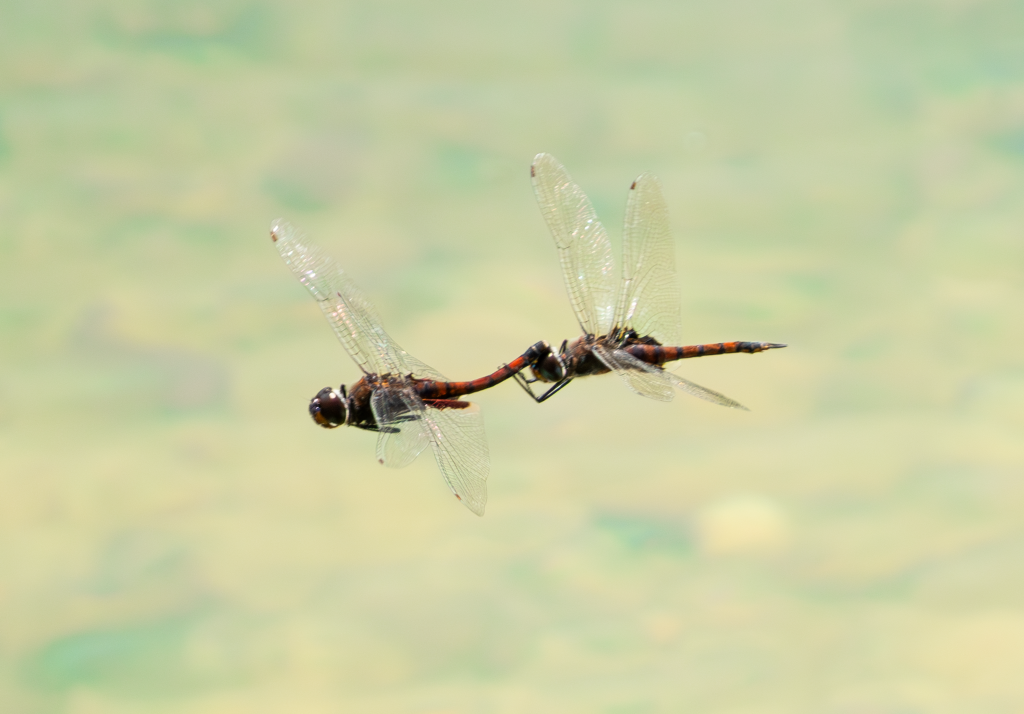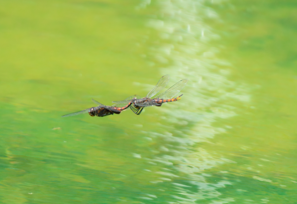This image captures a tandem pair of dragonflies in flight, a behavior associated with mating. The use of approximately 600mm focal length compresses the background, isolating the subjects against a smooth green field created by distant vegetation. A shutter speed of around 1/2000s was sufficient to maintain body sharpness while allowing minimal wing blur. The success of this frame lies in anticipating the pair’s repeated flight path and positioning accordingly.