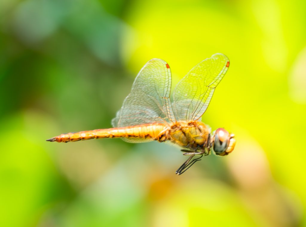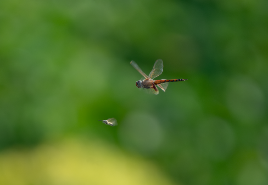 Captured using the Tamron 500mm lens, this image demonstrates a single dragonfly in lateral flight. The reduced focal length, compared to 600mm, provides slightly more manageable framing and tracking. Focus is placed on the thorax, ensuring that the majority of the body remains sharp. The aperture of approximately f/5.6 allows for sufficient light while maintaining acceptable depth of field.